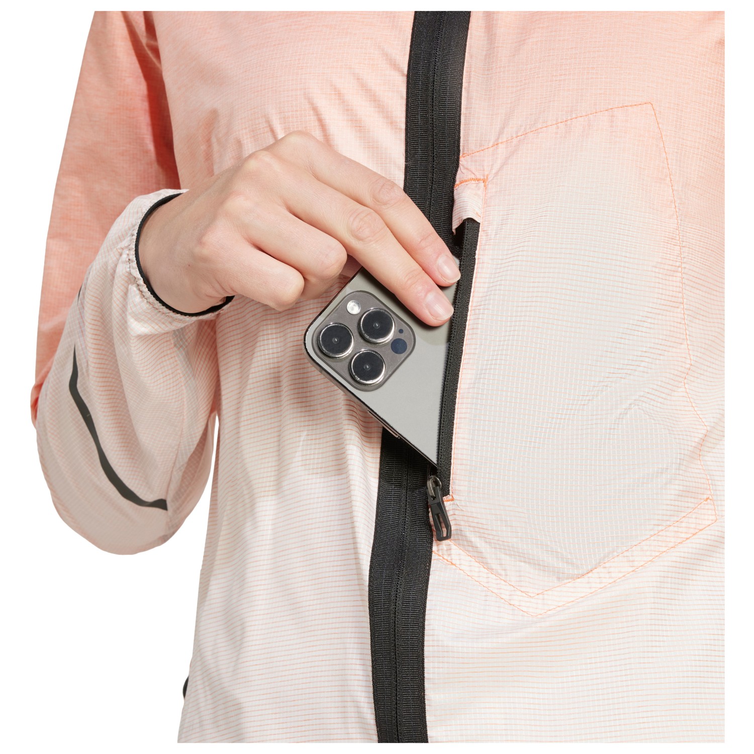 - elastische mouwboorden, elastische zoom, opbergbaar in eigen zak