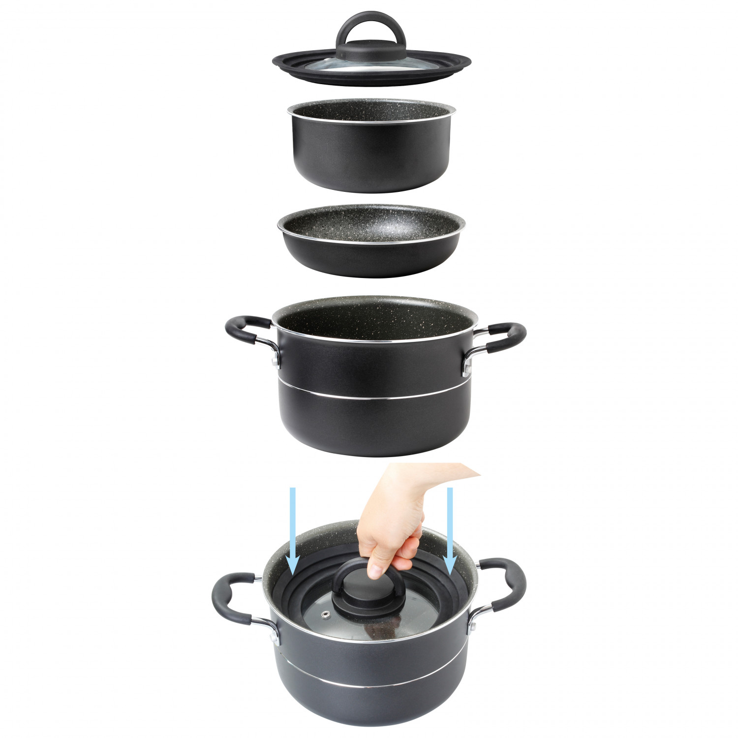 - kookpannen 20 cm, 16 cm; kookpannen 20 cm, 18 cm; deksels 20 cm, 18 cm, 16 cm