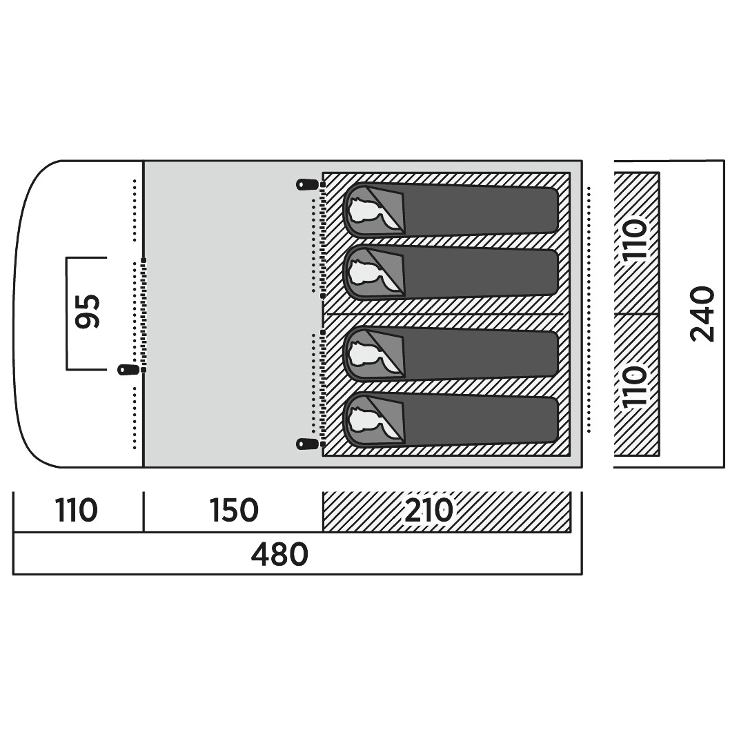 - twee gescheiden slaapgedeelten; donkere kleur binnenzijde in de slaapgedeelten