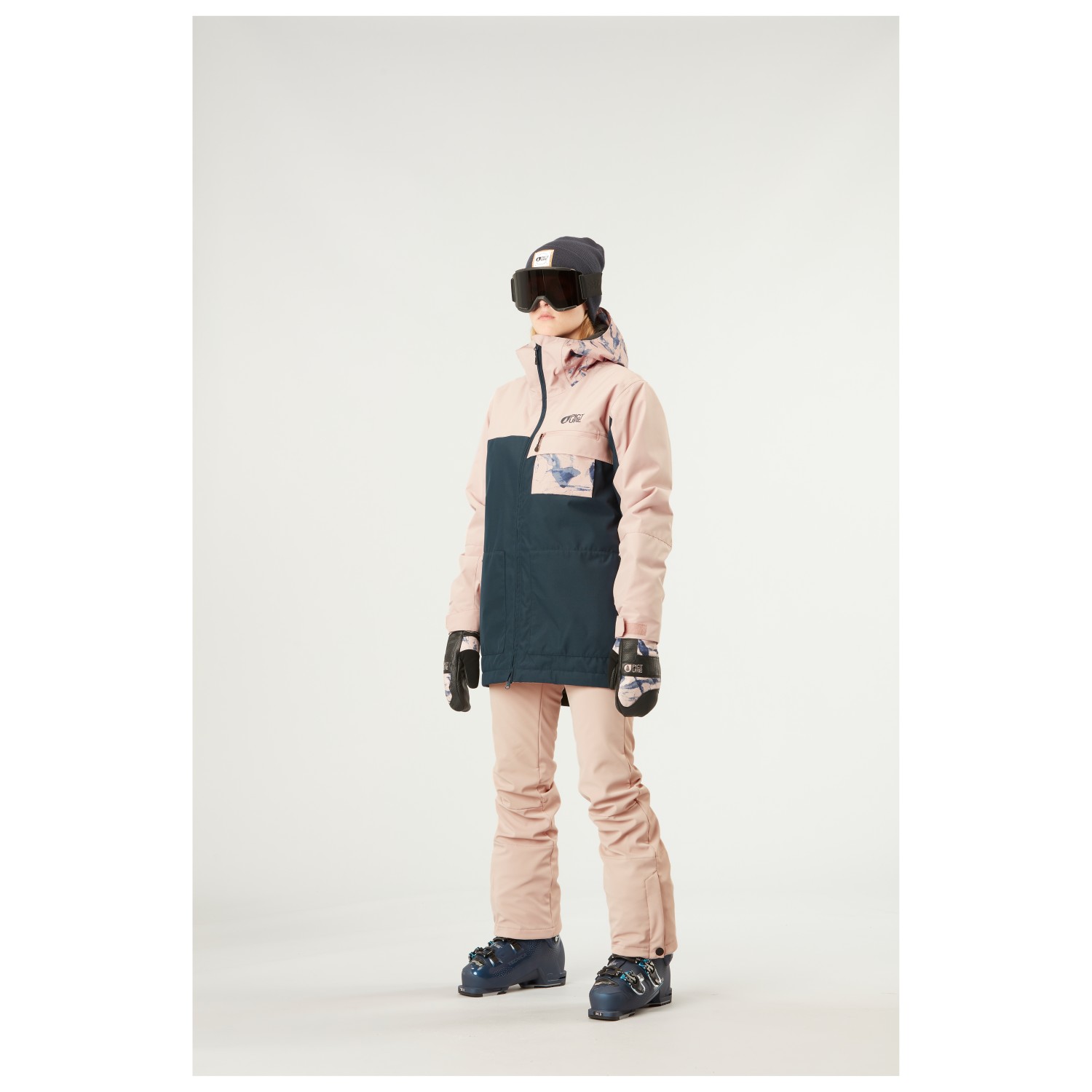 - duimgaten, geïntegreerd brillendoekje, broek-jasverbindingssysteem, trekkoord in de zoom, sneeuwvanger