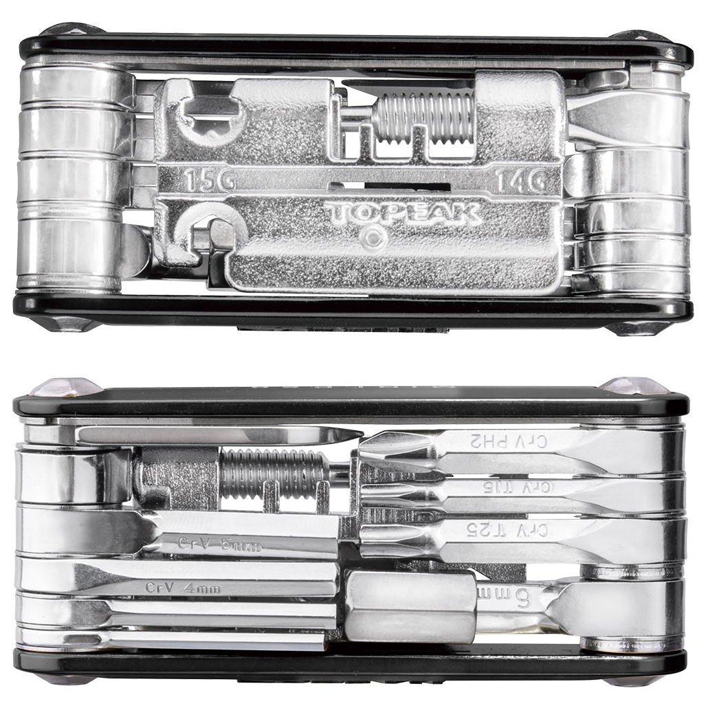 - kettingpons; fietskettinggereedschap; Torx T15 en T25; inbus (2,3,4,5,6 mm); schroevendraaier; spakensleutel (14G, 15G, Mavic M7, Shimano)