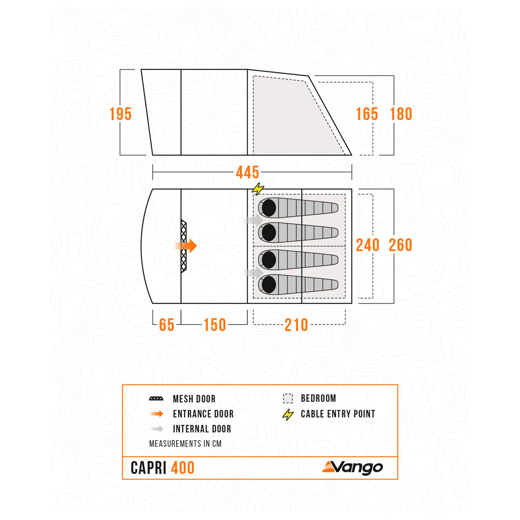 - 425 x 240 x 165 cm (lengte x breedte x min. hoogte); slaapgedeelte: 240 x 210 cm
