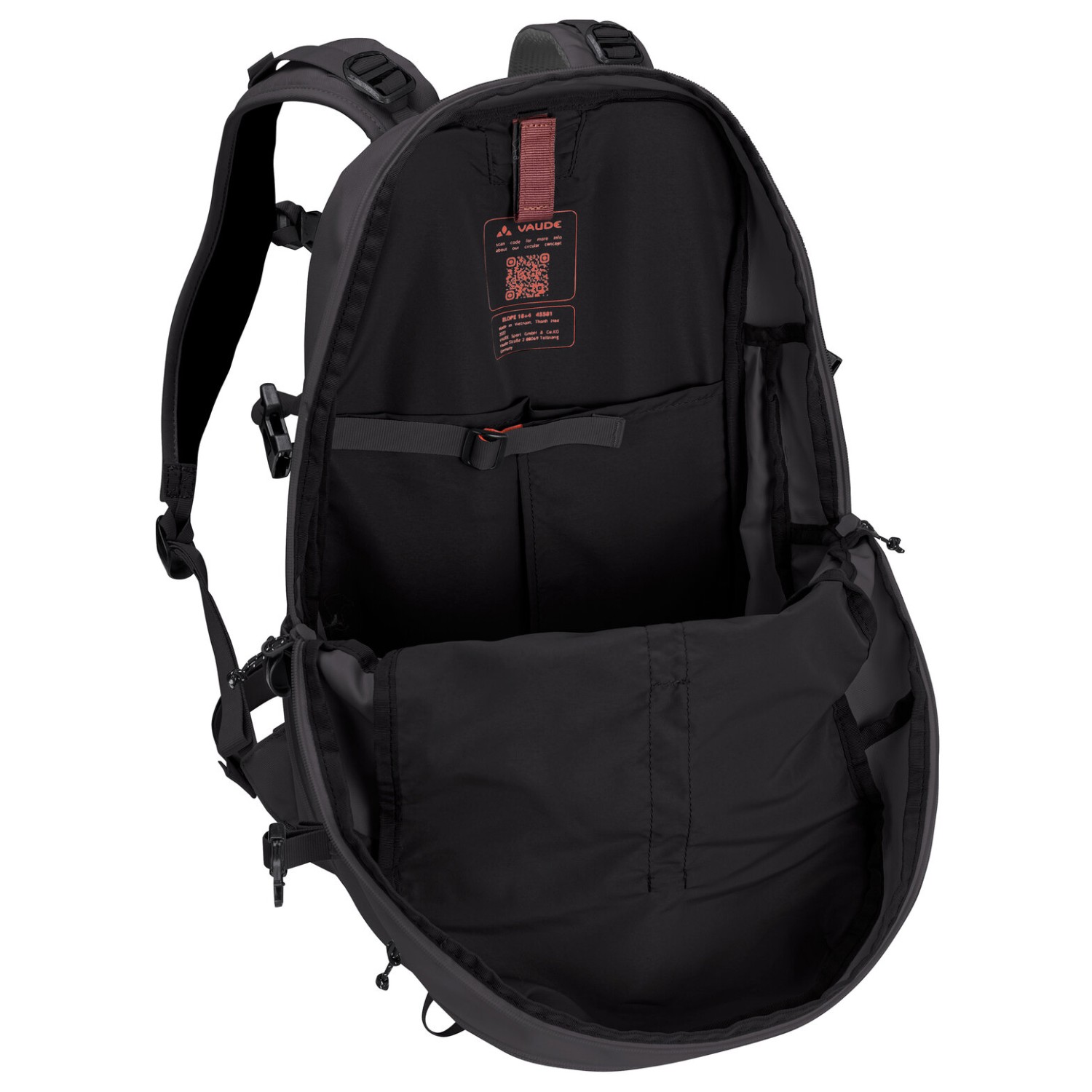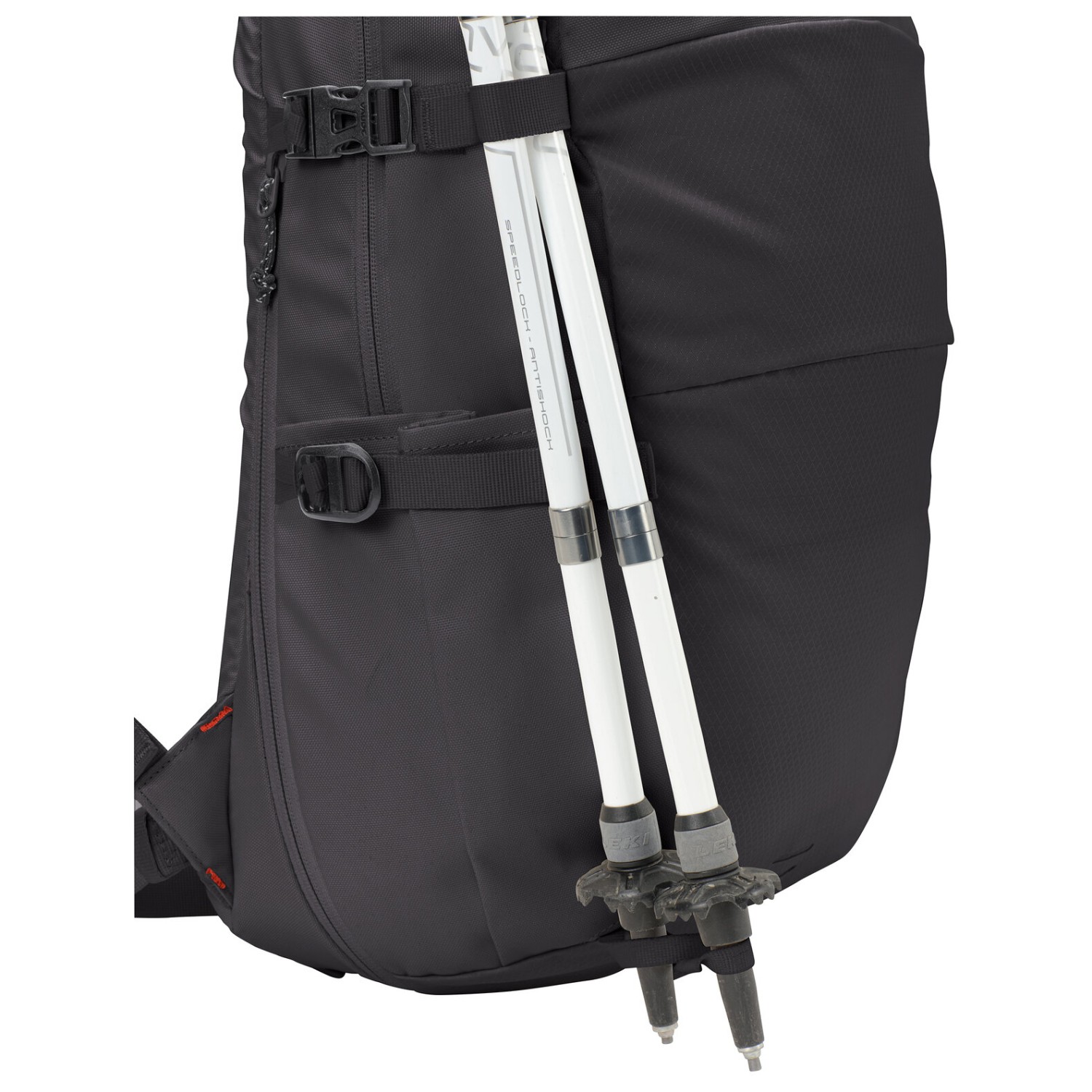 - 2 zijvakken, ijspikkel-/ wandelstokbevestiging, organizervak binnenin, achterlichthouder, voorvak met ritssluiting